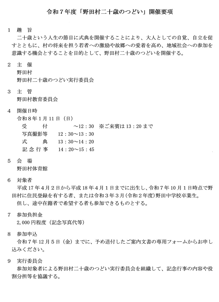 二十歳という人生の節目を迎える方々の新たな門出を祝して、村では「二十歳のつどい」を開催します。