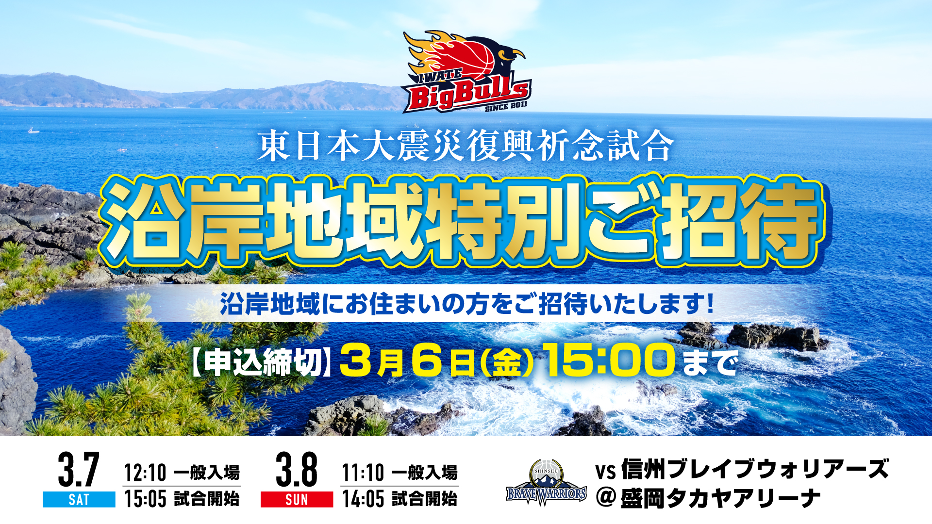 プロバスケットボールチーム・岩手ビッグブルズでは、3月7日(土曜日)・8日(日曜日)盛岡タカヤアリーナで開催するホームゲームに野田村を含む沿岸地域にお住まいの方をご招待いたします。お誘い合わせの上、是非会場で応援をよろしくお願いします。